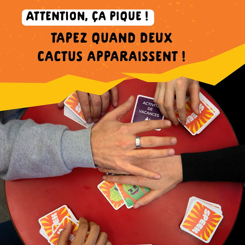C’est à ce moment-là que le nom SPEEK est né : une fusion entre Speak (parler) et Speed (rapidité), avec une touche ludique qui évoque aussi les “piques”… et qui a inspiré le cactus emblématique du jeu !
